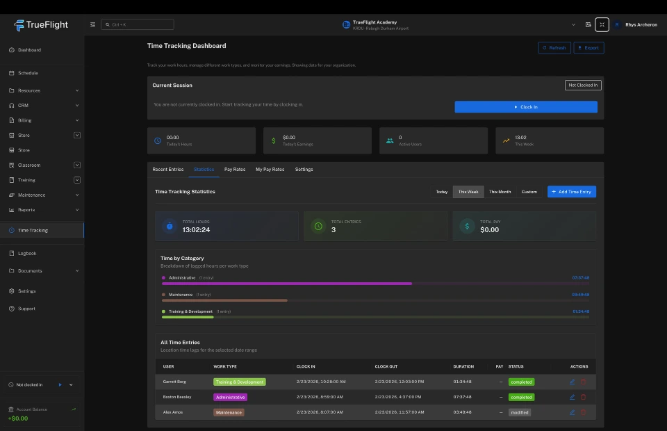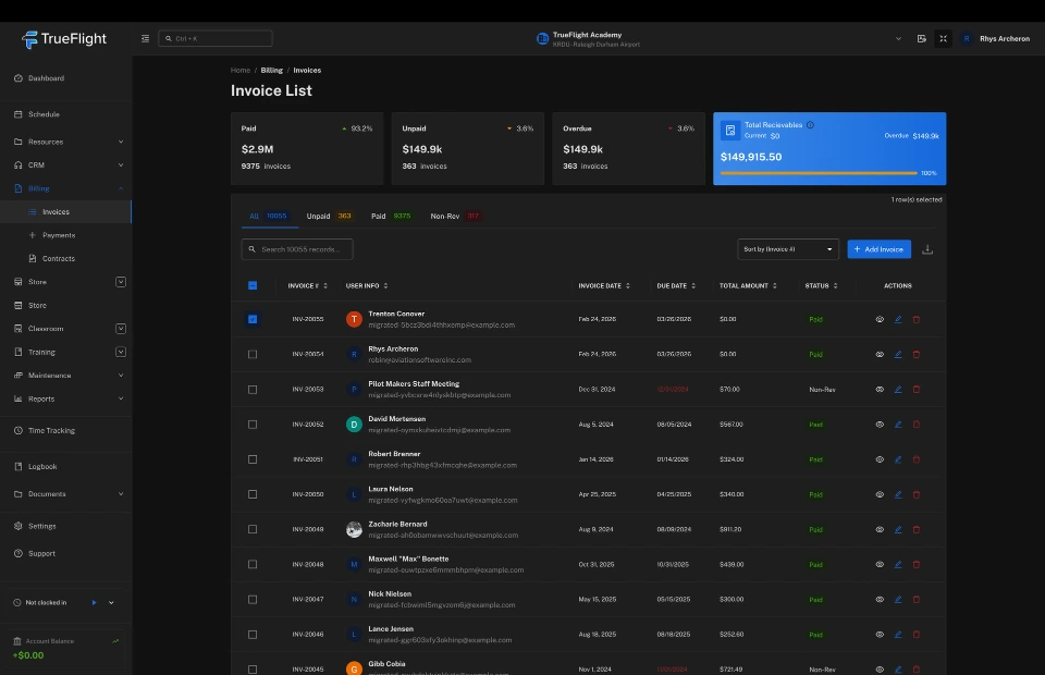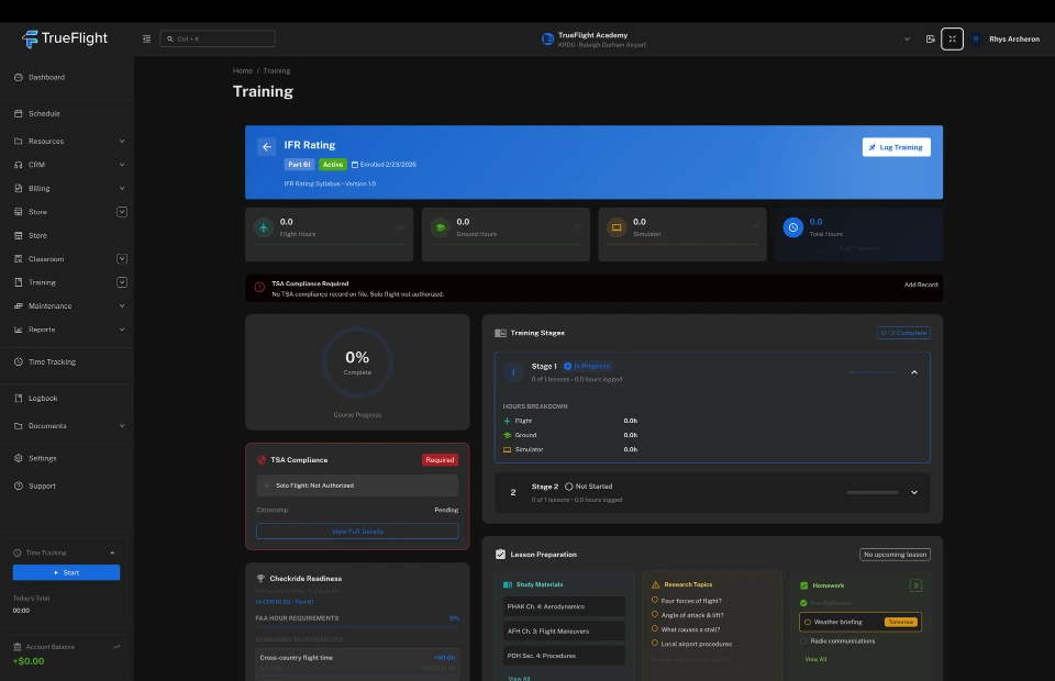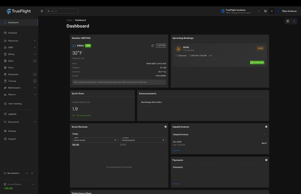 TrueFlight is the all-in-one aviation operations platform for flight schools and training centers. Schedule aircraft, dispatch flights, track maintenance, and handle billing - so you can spend less time at the desk and more time in the sky.